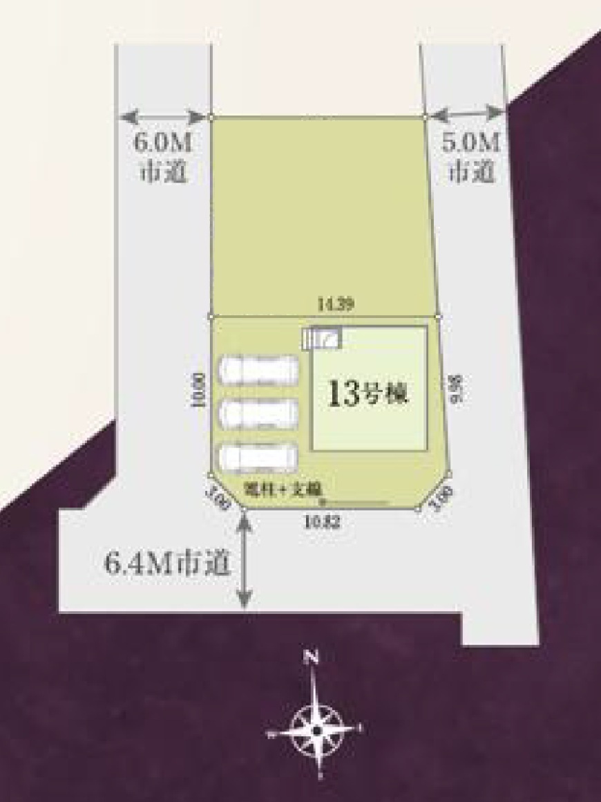 | 接道 | 東側5M公道に9.96M接道 西側6M公道に10M接道 南側6.4M公道に10.8M接道 |