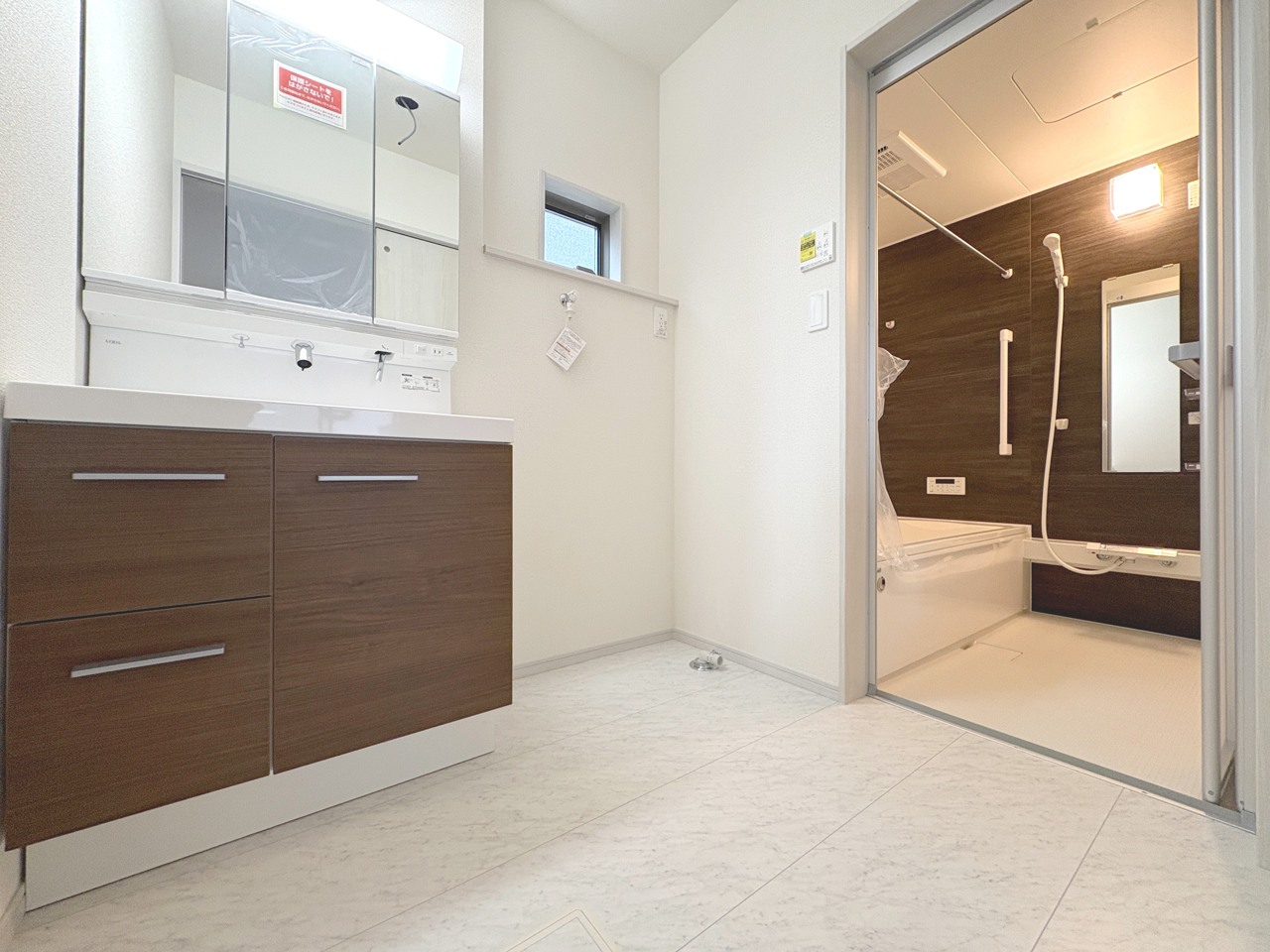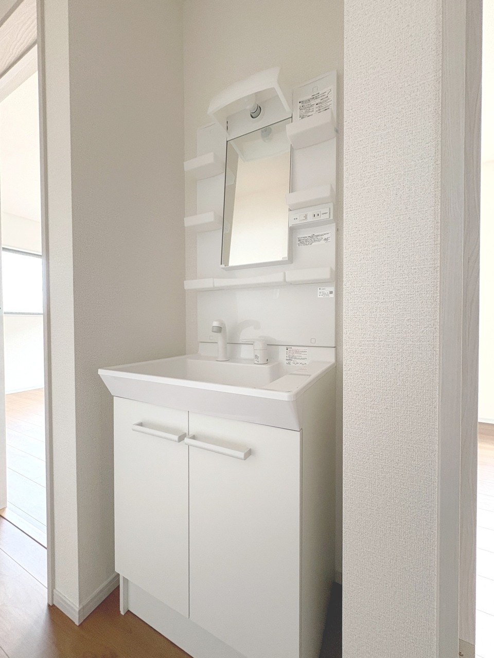 シャワー付きで機能的な3面鏡洗面台