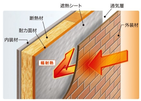 Felidiaに標準仕様の遮熱シートは、通気層構法における外装下地材として、高い性能を発揮します。 夏涼しく冬暖かいという遮熱性能と、躯体の劣化や腐敗を防ぐ透湿・防水性能に優れているだけでなく、これらの性能が長続きする、強靭な建材です。