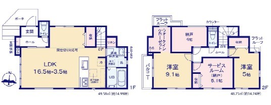 | 間取 | 2SLDK+4帖の納戸あり (LDK20帖、洋室9.1帖、洋室5帖、S5.1帖) | ||