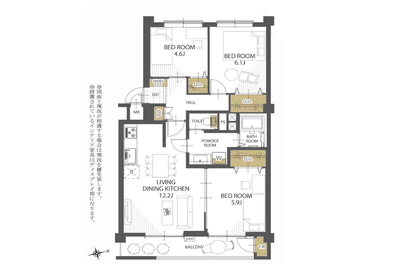 | 間取 | 3LDK (LDK12.2帖、洋室6.1帖、洋室5.9帖、洋室4.6帖) | ||
