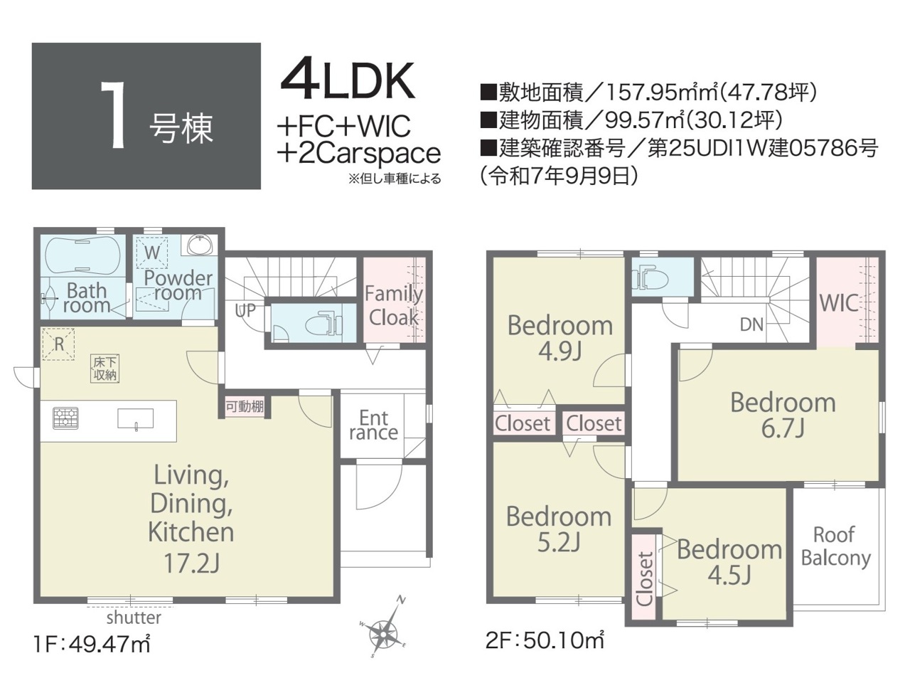 | 間取 | 4LDK + FC、WICあり (LDK17.2帖、洋室6.7帖、洋室5.2帖、洋室4.9帖、洋室4.5帖) | ||