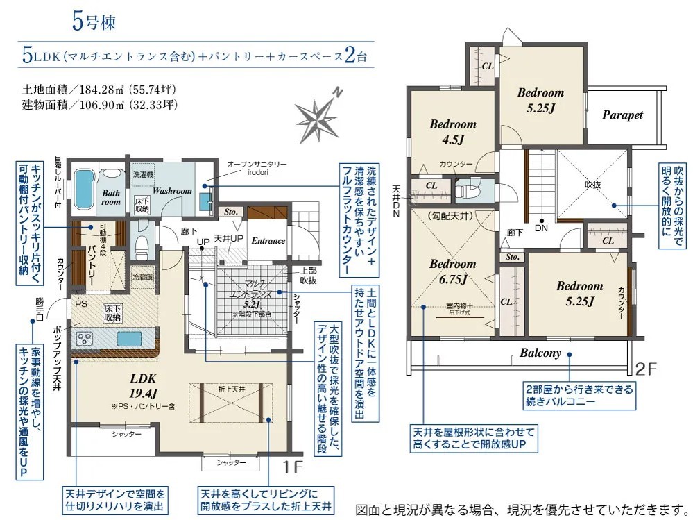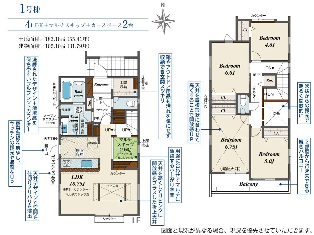 | 間取 | 4LDK~4LDK + マルチスキップ、パントリー、WIC、土間収納あり (LDK18.75帖、洋室6.75帖、洋室6帖、洋室5帖、洋室4.6帖) | ||