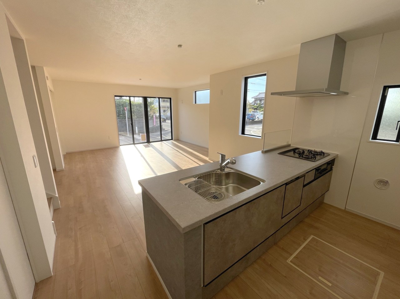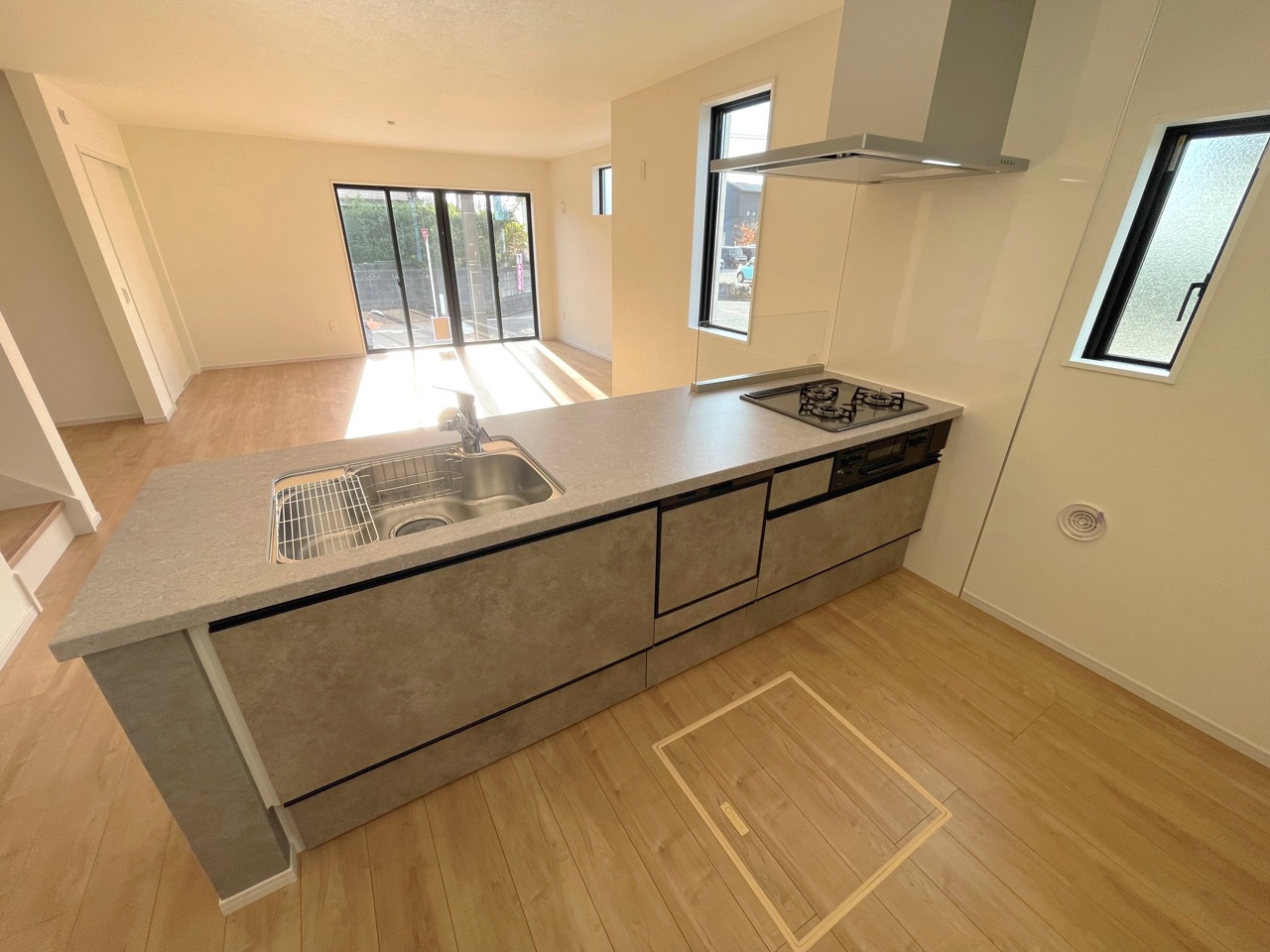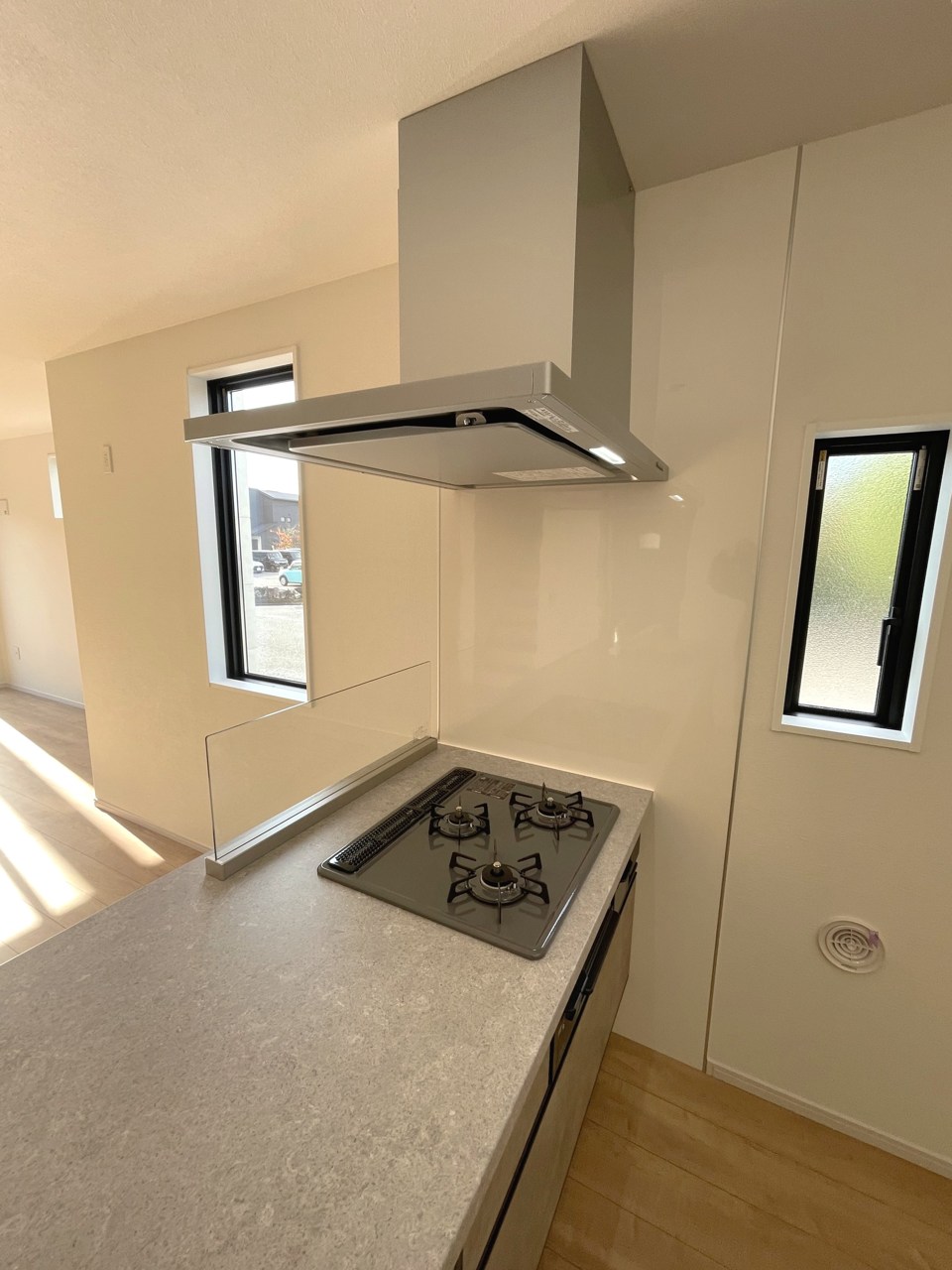 会話が弾む対面キッチンは小窓×換気扇の効果的な換気でリビングに臭い篭らず♪