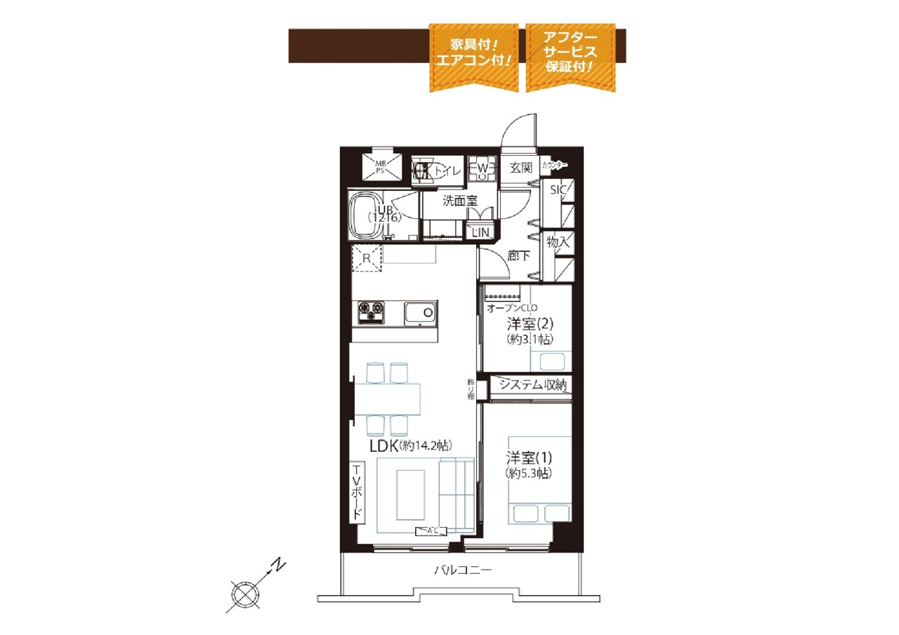 | 間取 | 2LDK (LDK14.2帖、洋室5.3帖、洋室3.1帖) | ||
