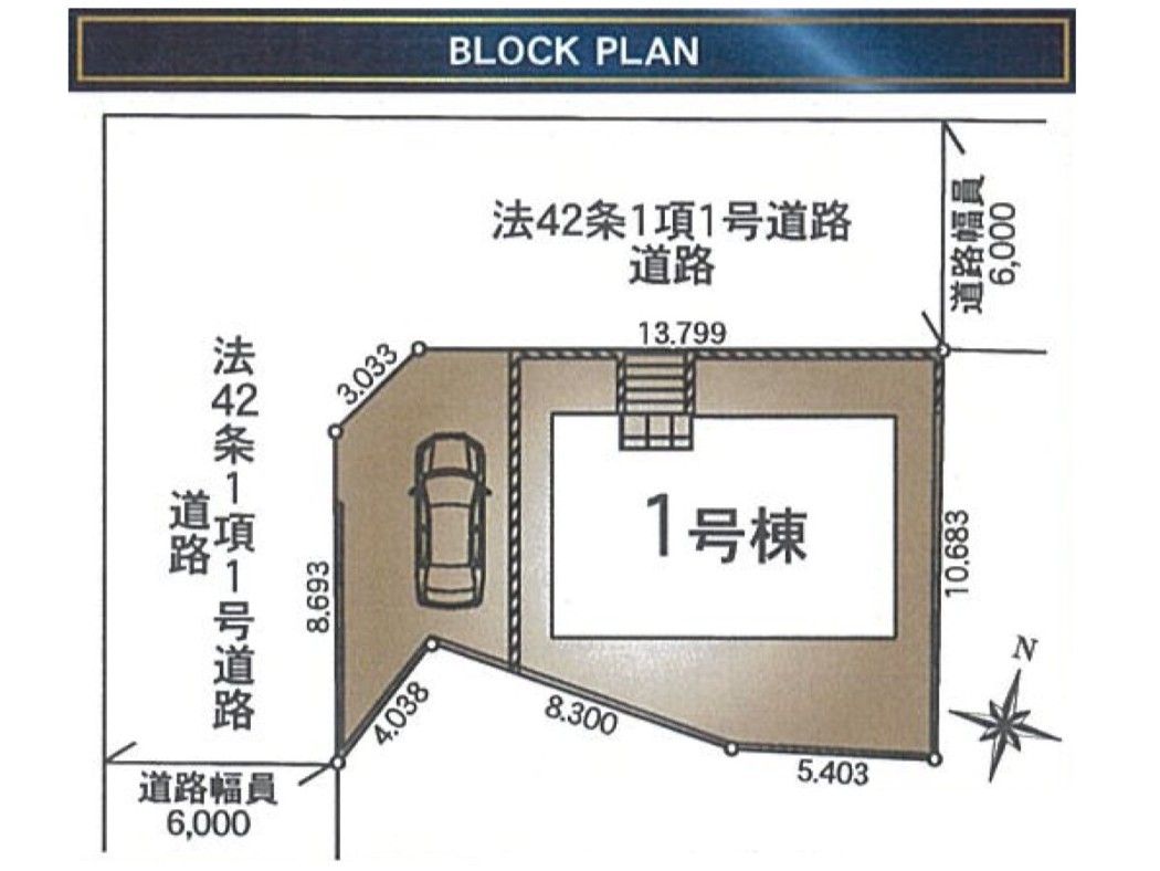 | 接道 | 西側6M公道に8.69M接道 北側6M公道に13.79M接道 |