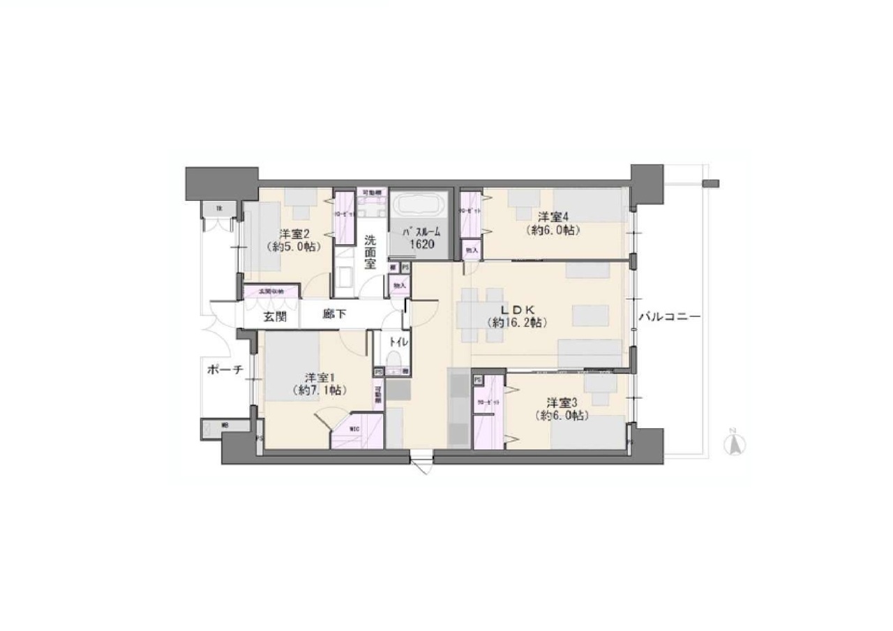 | 間取 | 4LDK (LDK16.2帖、洋室7.1帖、洋室5帖、洋室6帖、洋室6帖) | ||