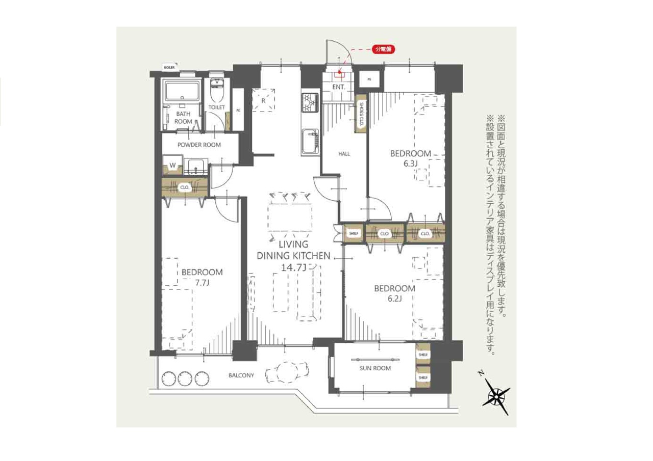 | 間取 | 3LDK (LDK14.7帖、洋室7.7帖、洋室6.3帖、洋室6.2帖) | ||