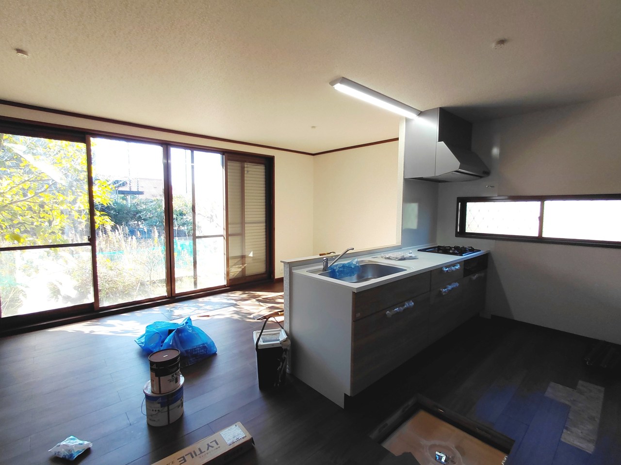 フォロアタイル貼り、1階床調整、キッチン下地、お風呂場下地