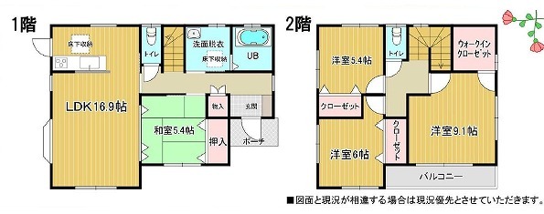 | 間取 | 4LDK + WICあり (LDK16.9帖、和室5.4帖、洋室9.1帖、洋室6帖、洋室5.4帖) | ||