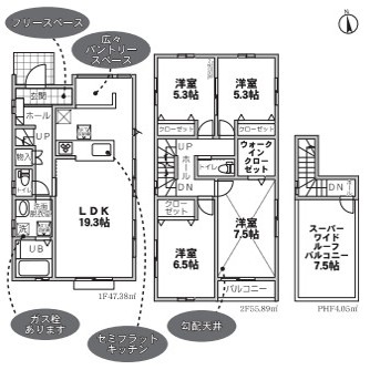 | 間取 | 4LDK (LDK19.3帖、洋室7.5帖、洋室6.5帖、洋室5.3帖、洋室5.3帖) | ||