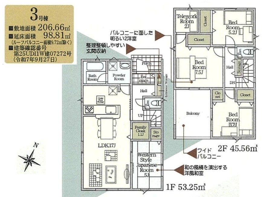 | 建築確認番号 | 第25UDI1W建07270号、他 | 駐車スペース | 2台(カースペース:並列) |
