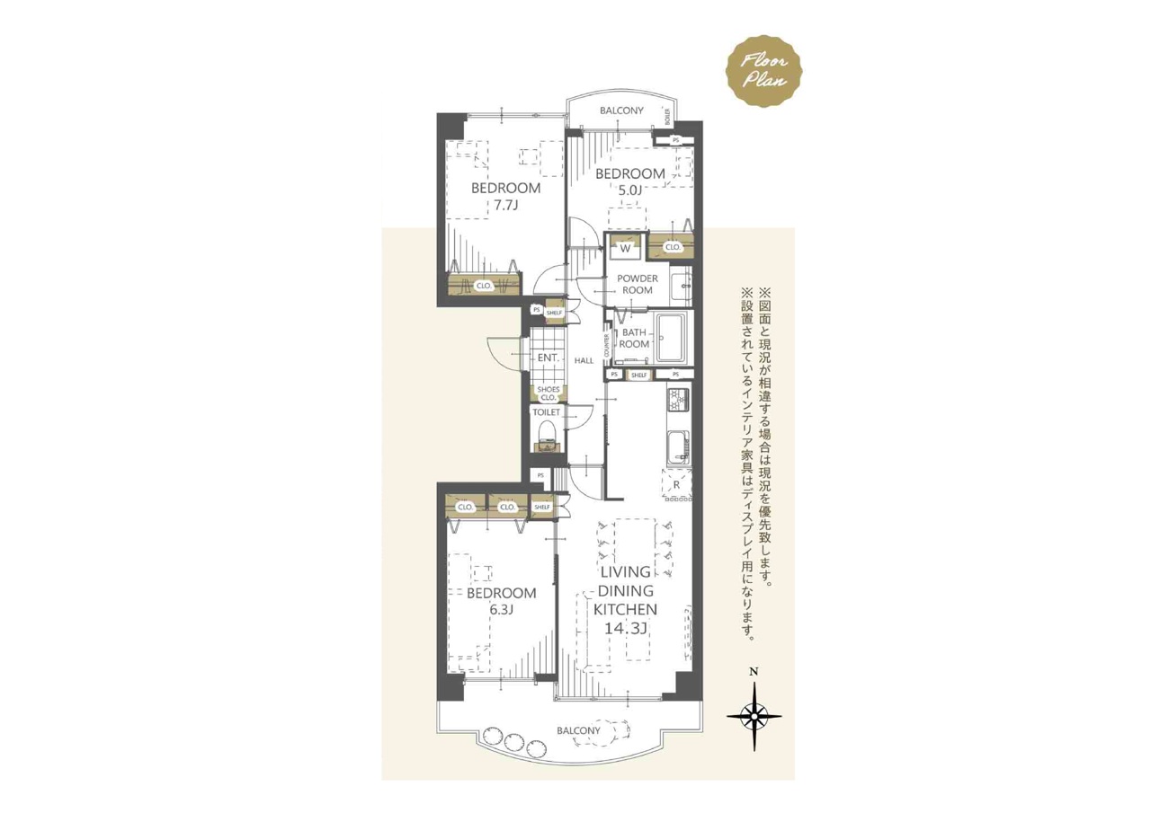 | 間取 | 3LDK (LDK14.3帖、洋室7.7帖、洋室6.3帖、洋室5帖) | ||