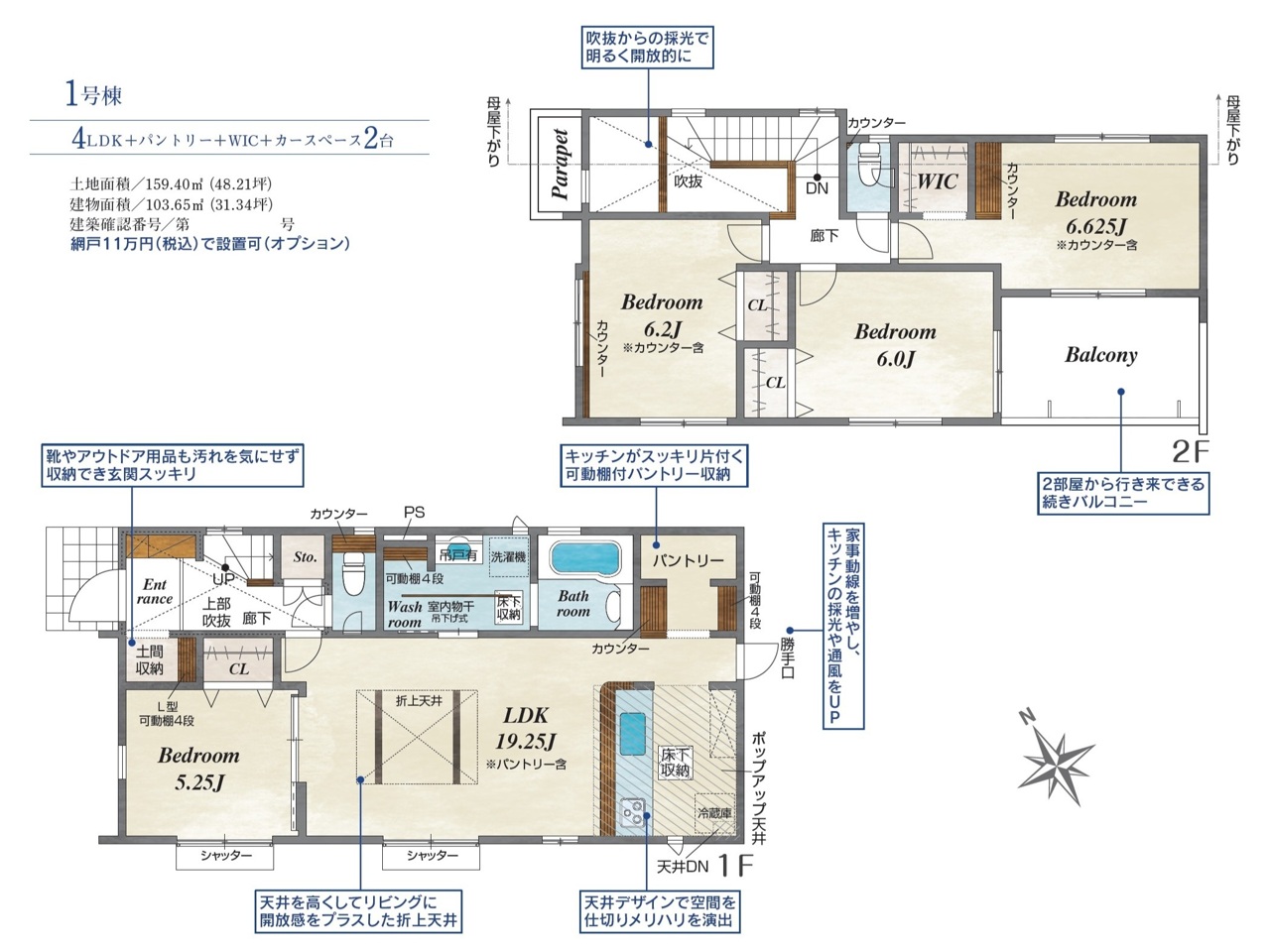 | 間取 | 4LDK + WIC、パントリー、吹抜、土間収納あり (LDK19.25帖、洋室6.625帖、洋室6.2帖、洋室6帖、洋室5.25帖) | ||