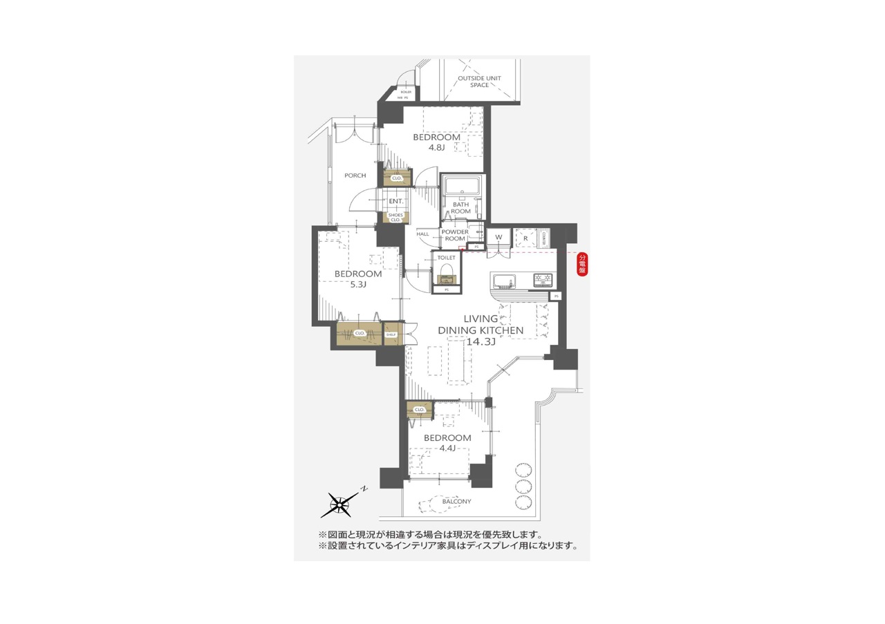 | 間取 | 3LDK (LDK14.3帖、洋室5.3帖、洋室4.8帖、洋室4.4帖) | ||
