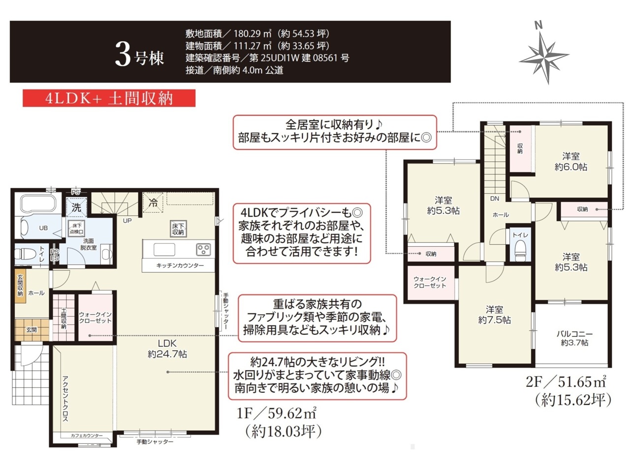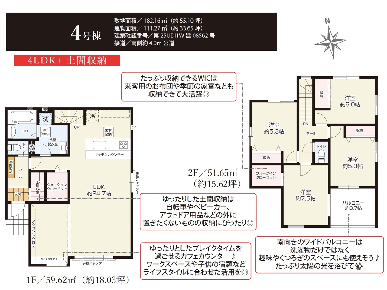 | 間取 | 4LDK~4LDK + WIC、土間収納あり | ||
