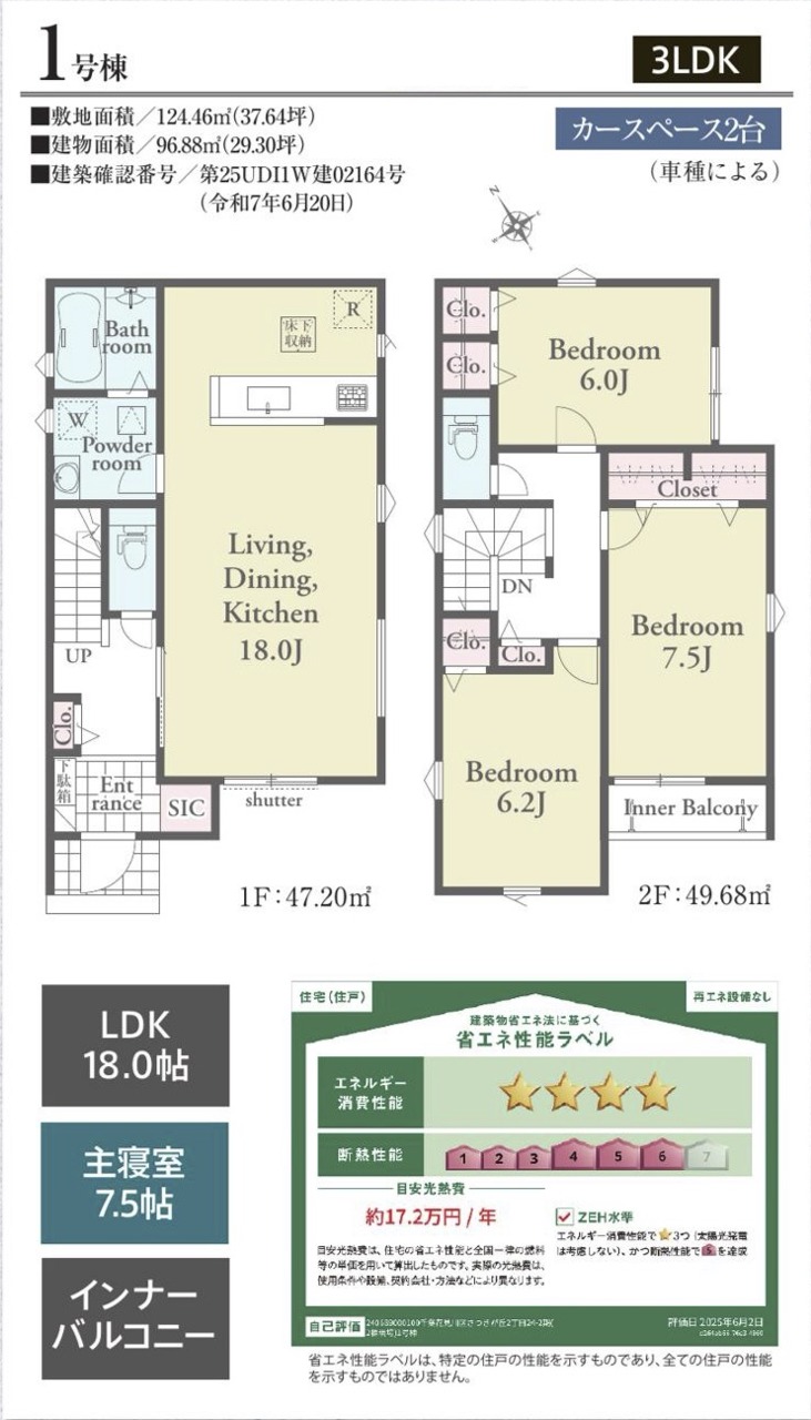 | 省エネ性能表示 | 再エネ設備:あり エネルギー消費性能:★★★★~★★★★ 断熱性能:6段階~6段階 目安光熱費:約17.2万円/年~約18.6万円/年 |