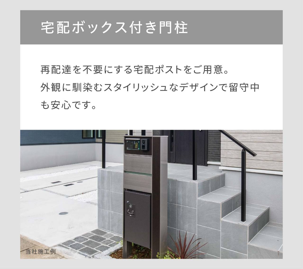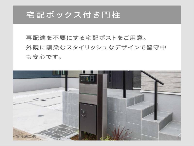 門柱には、外出時も荷物を受け取ることができる宅配ボックスを搭載。 外観デザインに寄り添ったスタイリッシュなデザインポストです。