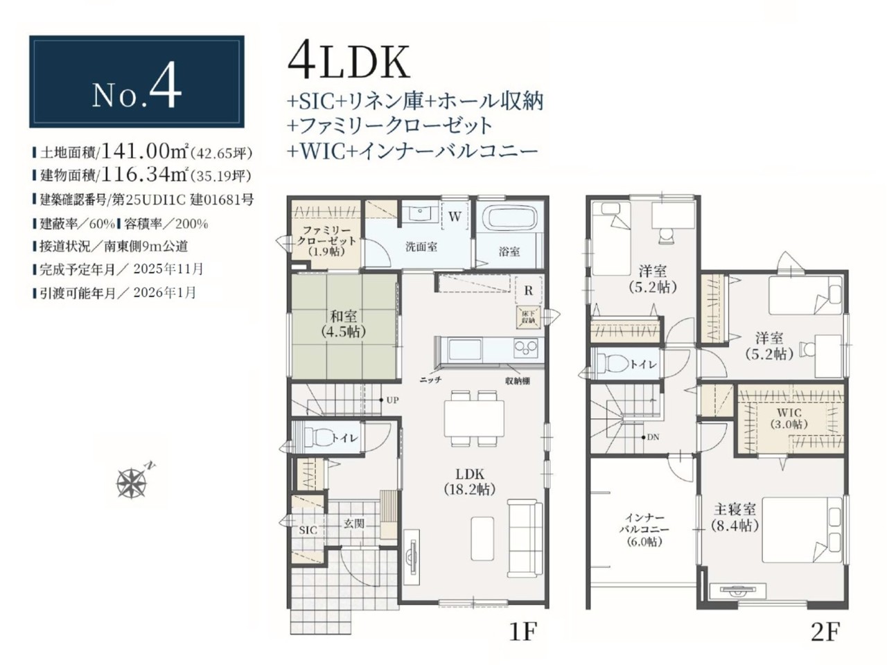 | 間取 | 3LDK~4LDK + SIC、リネン庫、FC、WIC、タタミスペースあり | ||