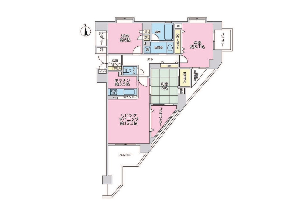 | 間取 | 3LDK (LD12.1帖、K3.5帖、洋室8.1帖、洋室6帖) | ||