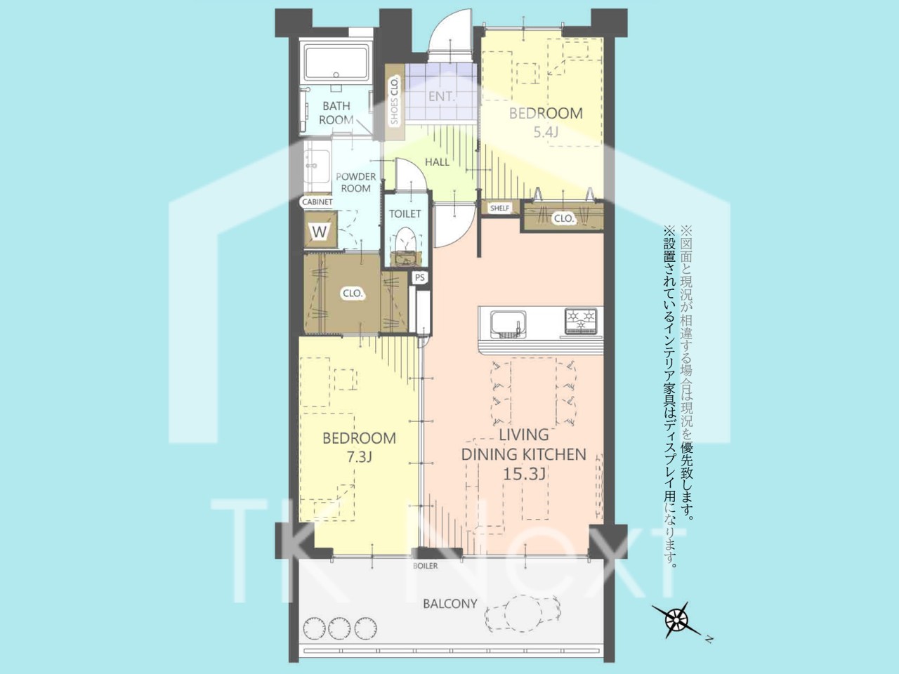 | 間取 | 2LDK (LDK15.3帖、洋室7.3帖、洋室5.4帖) | ||