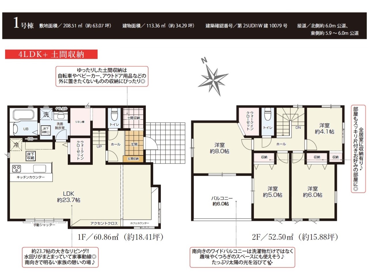 | 間取 | 4LDK + 2WIC、リネン庫、土間収納あり (LDK23.7帖、洋室8帖、洋室6帖、洋室5帖、洋室4.1帖) | ||