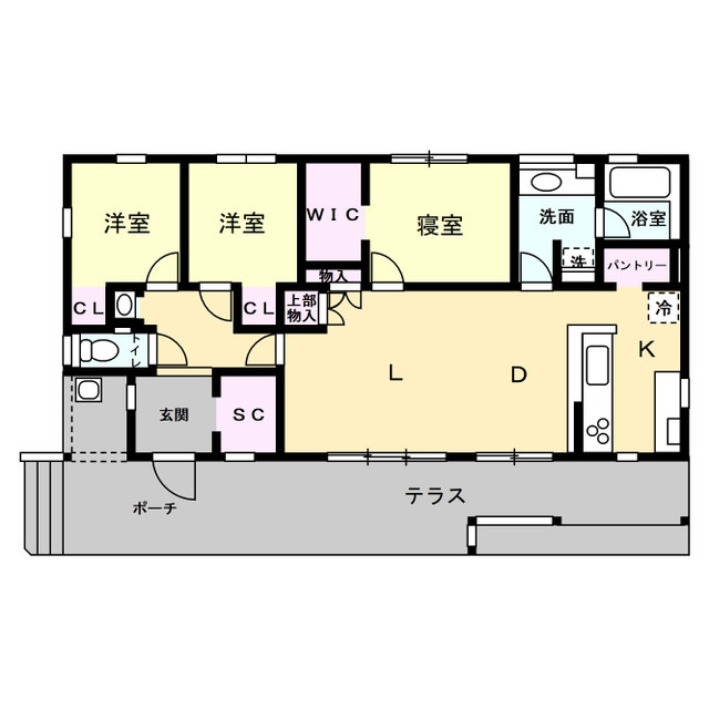 LDKからウッドテラスへつながる間取りで、天気の良い日は外と室内がゆるやかにつながる暮らしを楽しめます。
