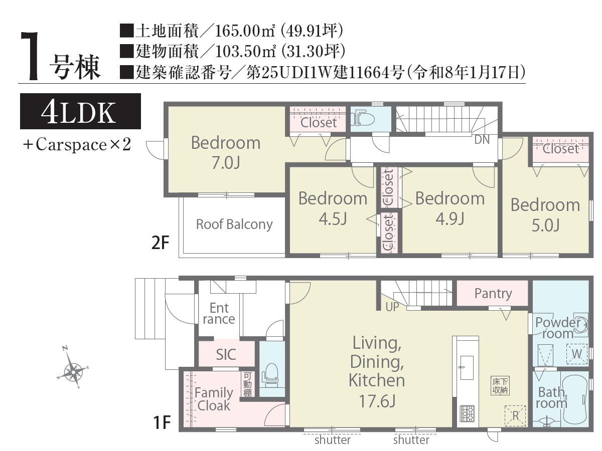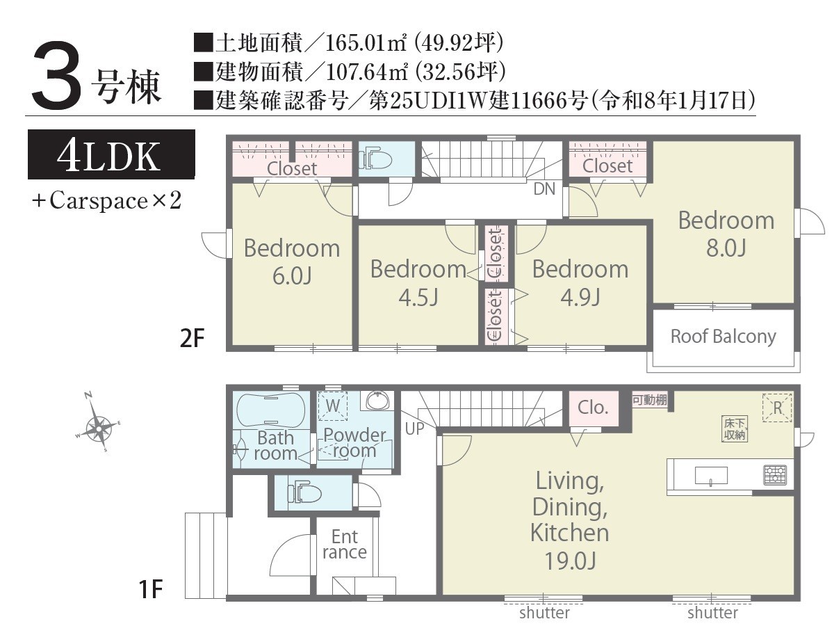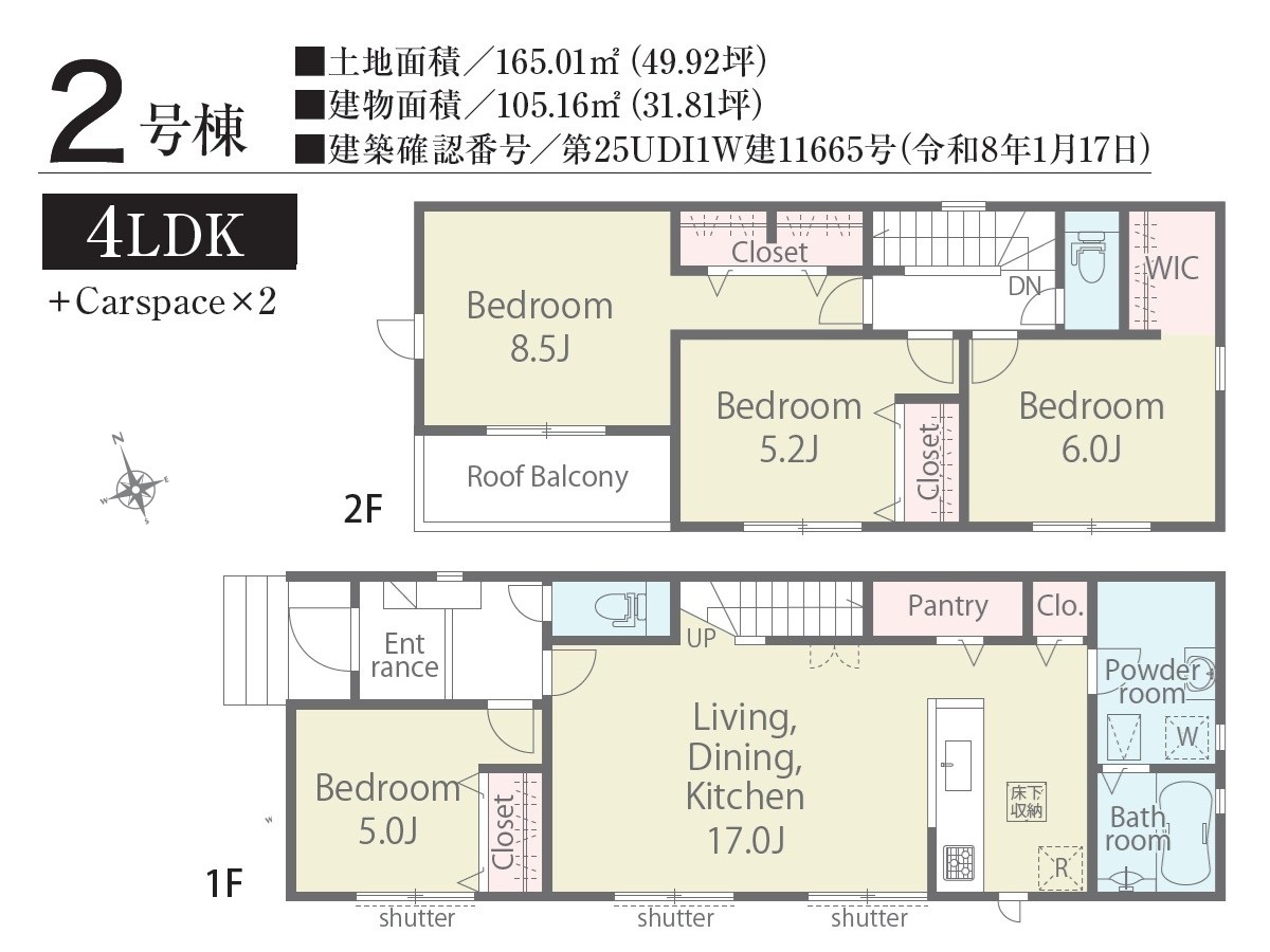 | 建築確認番号 | 第25UDI1W建11664号、他 | 駐車スペース | 2台(カースペース:並列) |