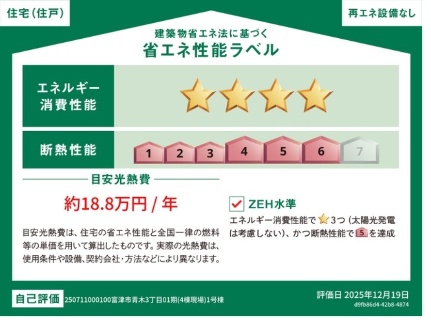 | 省エネ性能表示 | エネルギー消費性能:★★★~★★★★ 断熱性能:6段階~6段階 目安光熱費:約18.2万円/年~約18.8万円/年 |