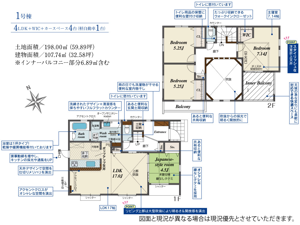 | 間取 | 4LDK + WIC (LDK17帖、洋室7.14帖、洋室5.25帖、洋室5.25帖、和室4.5帖) | ||