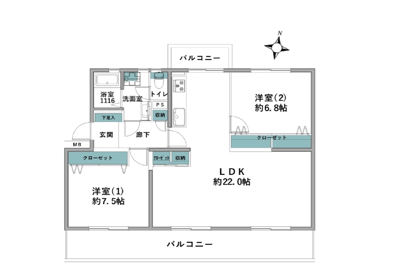 | 間取 | 2LDK (LDK22帖、洋室7.5帖、洋室6.8帖) | ||