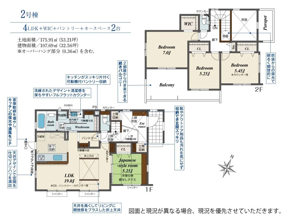 | 間取 | 4LDK~4LDK + 吹抜、WIC、タタミコーナー、パントリー、土間収納あり | ||