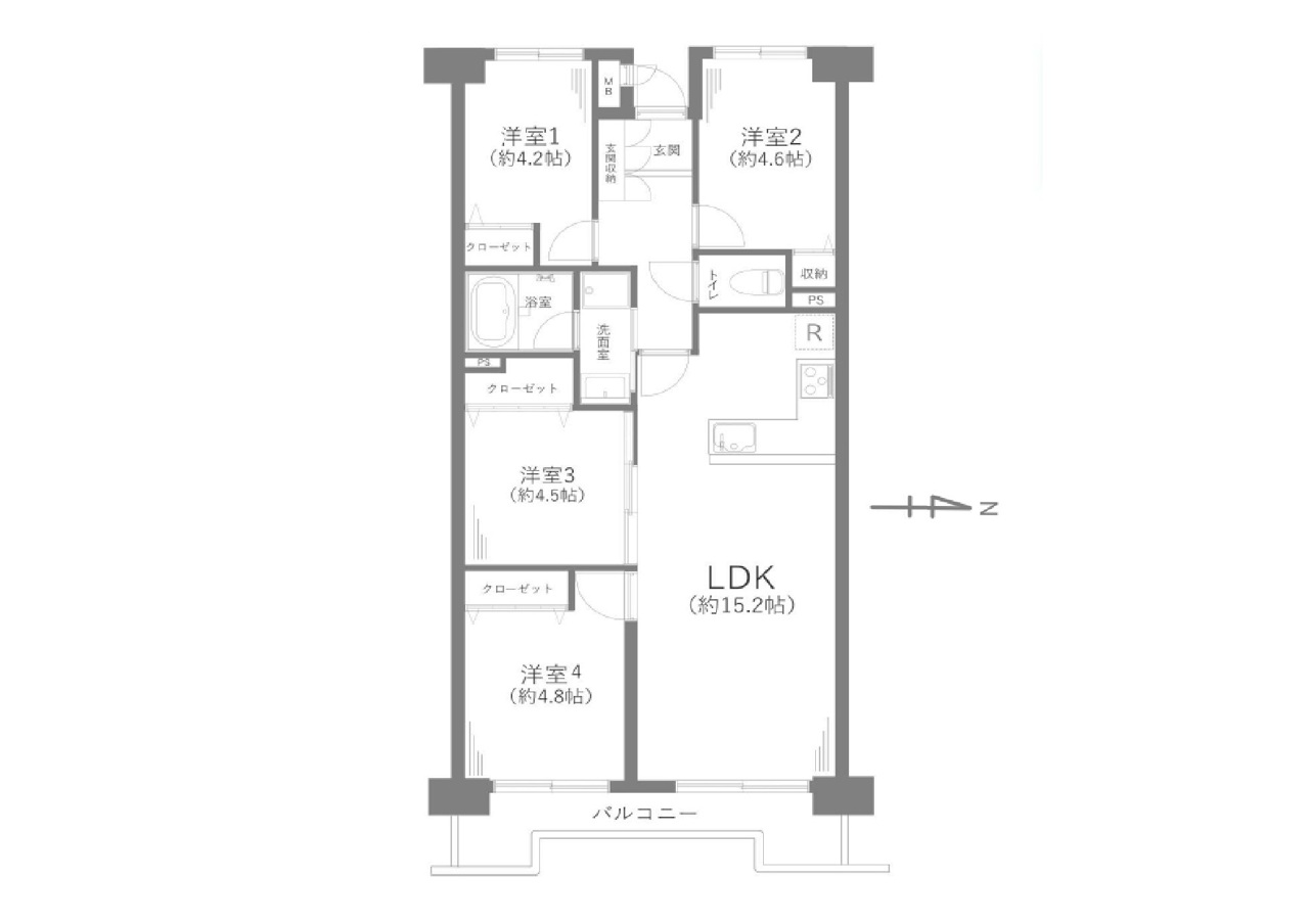 | 間取 | 4LDK (LDK15.2帖、洋室4.2帖、洋室4.6帖、洋室4.5帖、洋室4.8帖) | ||