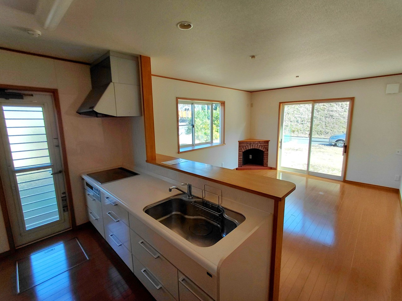 大きな窓から直接お庭に出られます♪BBQなどの準備にも便利そう♪