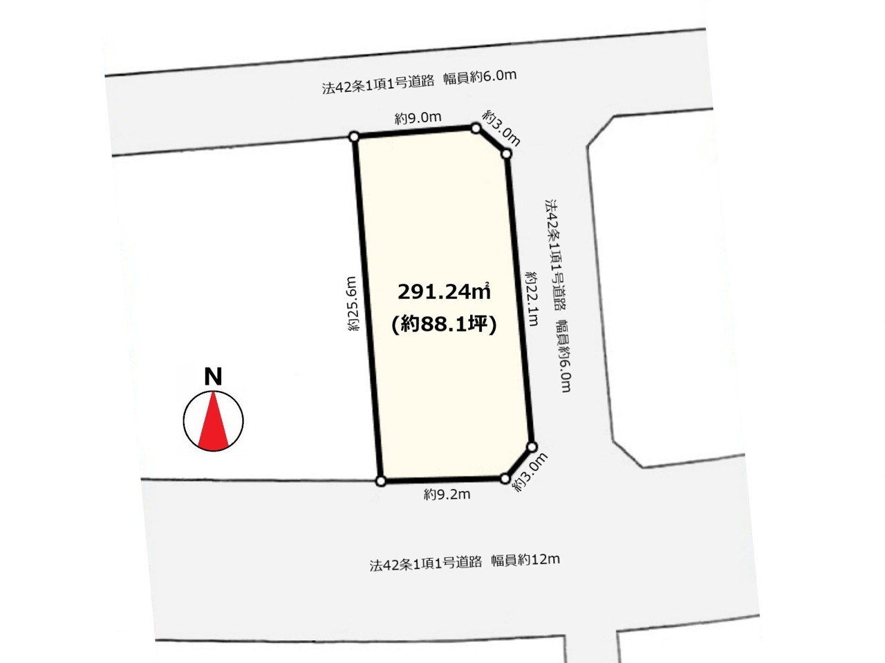 | 接道 | 南側12M公道に9.2M接道 東側6M公道に22.1M接道 北側6M公道に9M接道 |