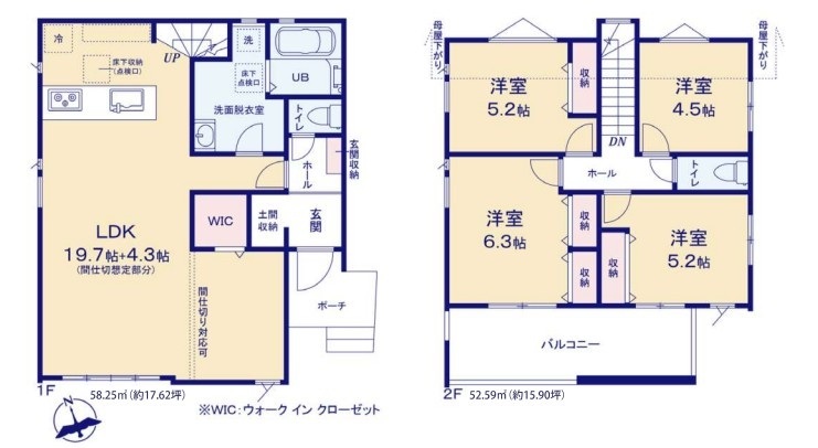 | 間取 | 4LDK + LDK24帖を19.7帖+4.3帖に間仕切り対応可能 (LDK24帖、洋室6.3帖、洋室5.2帖、洋室5.2帖、洋室4.5帖) | ||
