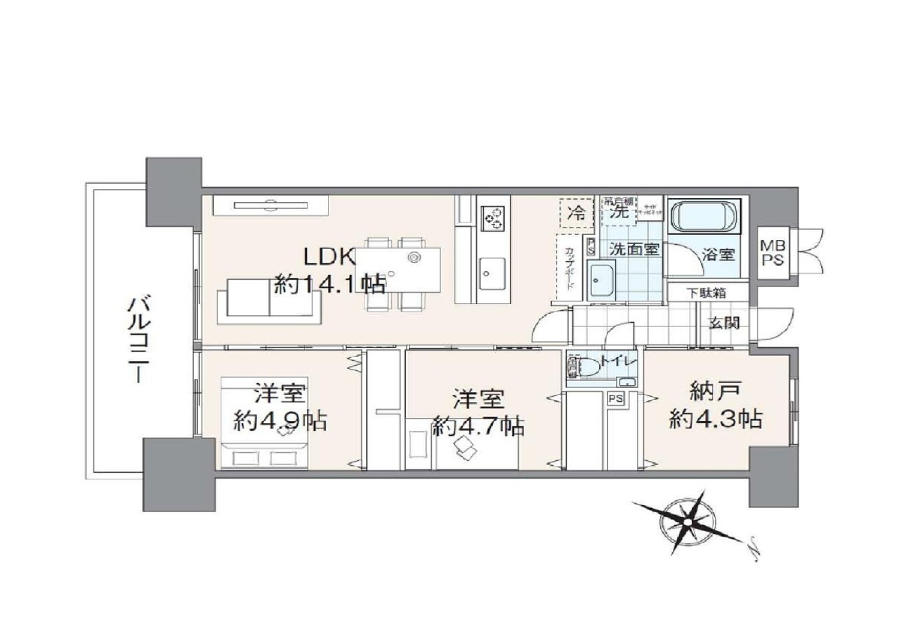 | 間取 | 2SLDK (LDK14.4帖、洋室4.9帖、洋室4.7帖、S4.3帖) | ||