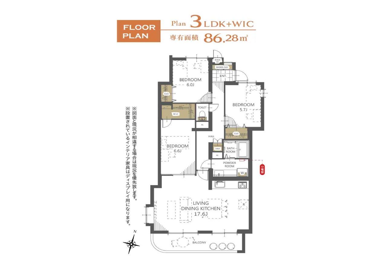 | 間取 | 3LDK + WIC (LDK17.6帖、洋室6帖、洋室5.7帖) | ||