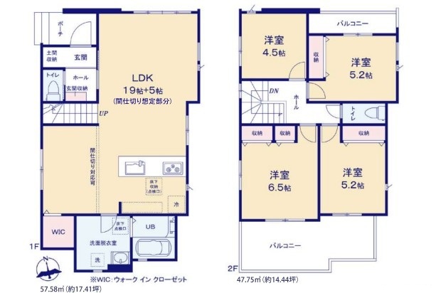 | 間取 | 4LDK + LDK24帖を19帖+5帖に間仕切り対応可能 (LDK24帖、洋室6.5帖、洋室5.2帖、洋室5.2帖、洋室4.5帖) | ||