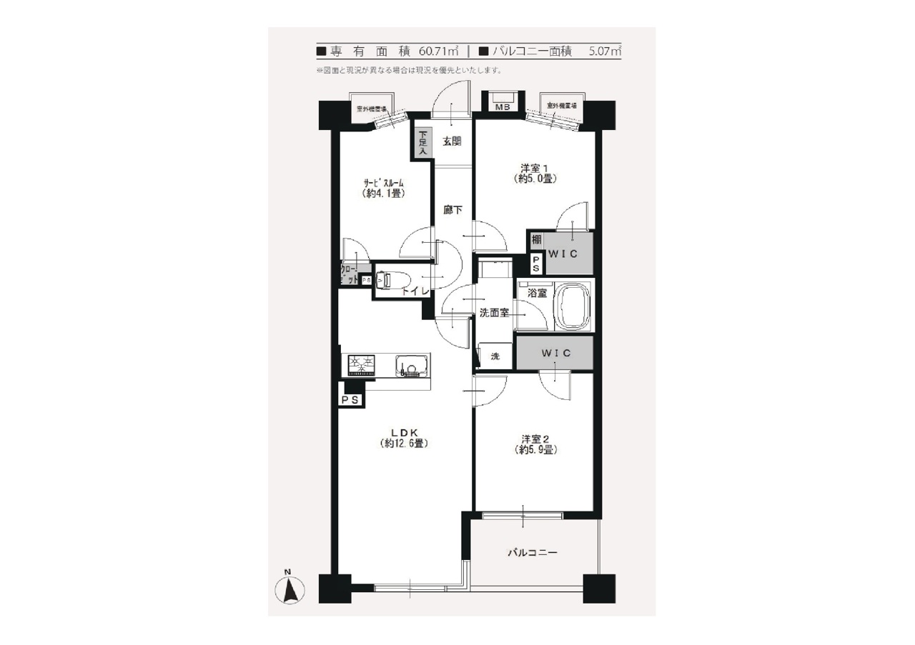 | 間取 | 2SLDK + 2WIC (LDK12.6帖、洋室5帖、洋室5.9帖、S4.1帖) | ||