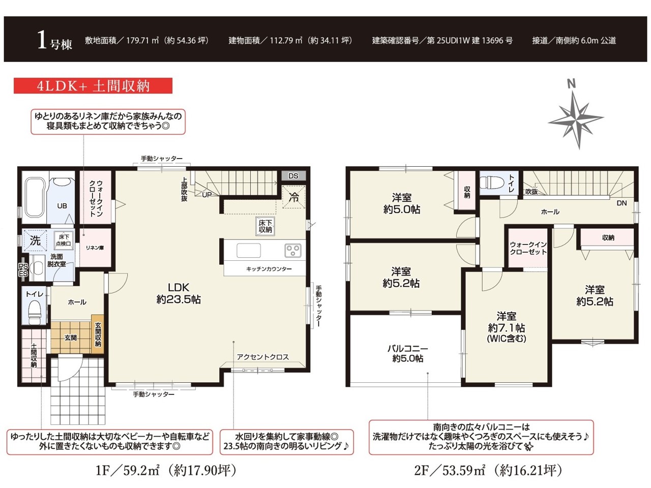 | 間取 | 4LDK + 2WIC、リネン庫、土間収納あり (LDK23.5帖、洋室7.1帖、洋室5.2帖、洋室5.2帖、洋室5帖) | ||