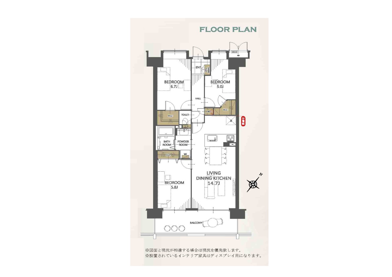 | 間取 | 3LDK (LDK14.7帖、洋室6.7帖、洋室5.8帖、洋室5帖) | ||