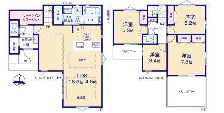 | 間取 | 4LDK + 床暖房、間仕切り対応可能 (LDK23.1帖、洋室7.3帖、洋室5.3帖、洋室5.2帖、洋室3.4帖) | ||