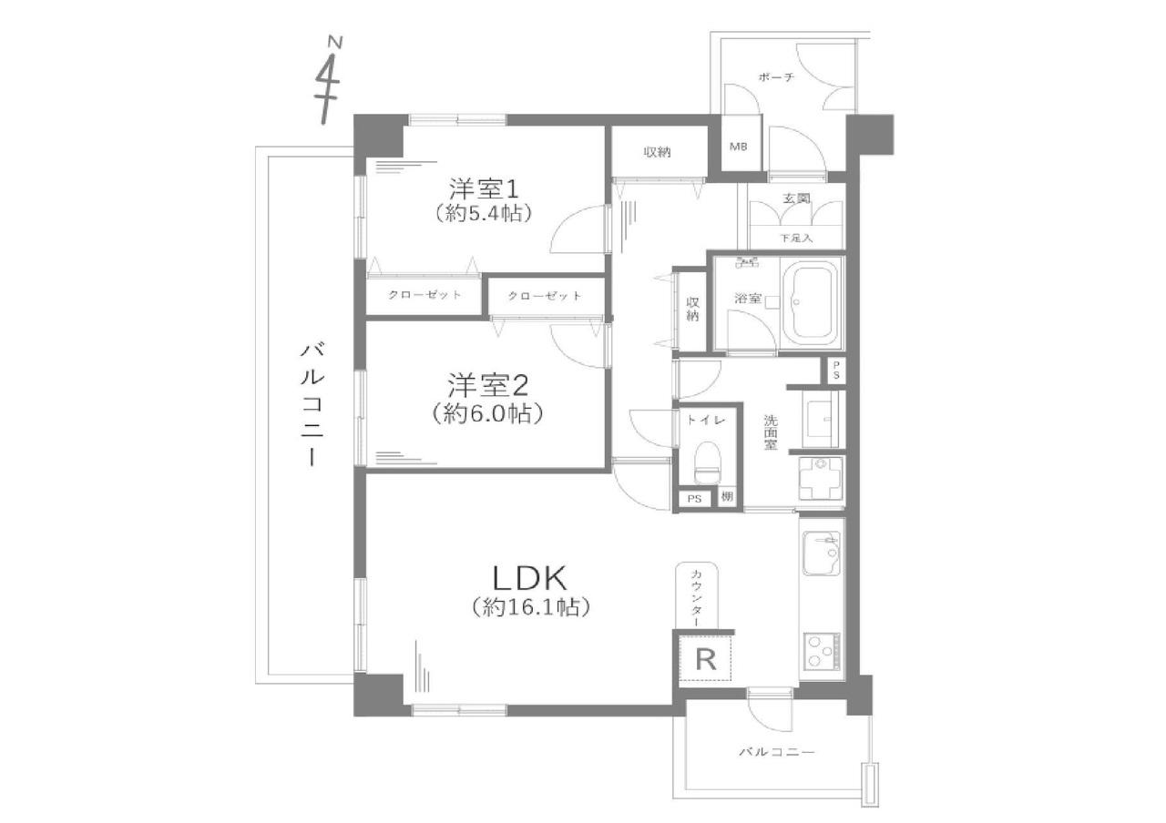 | 間取 | 2LDK (LDK16.1帖、洋室5.4帖、洋室6帖) | ||