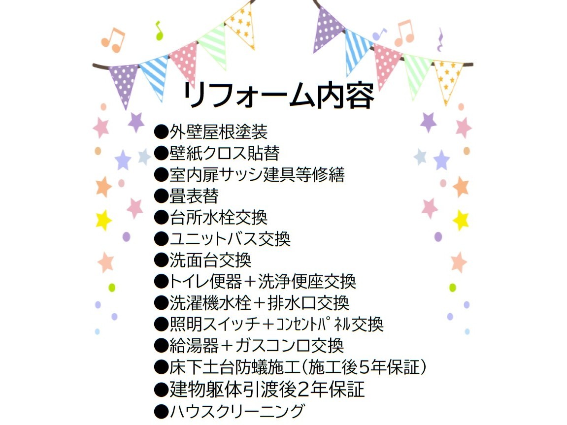 外壁屋根塗装/壁紙クロス貼替/室内扉サッシ建具等修繕/畳表替/床下土台防蟻施工(施工後5年保証)/建物躯体引渡後2年保証/ハウスクリーニング