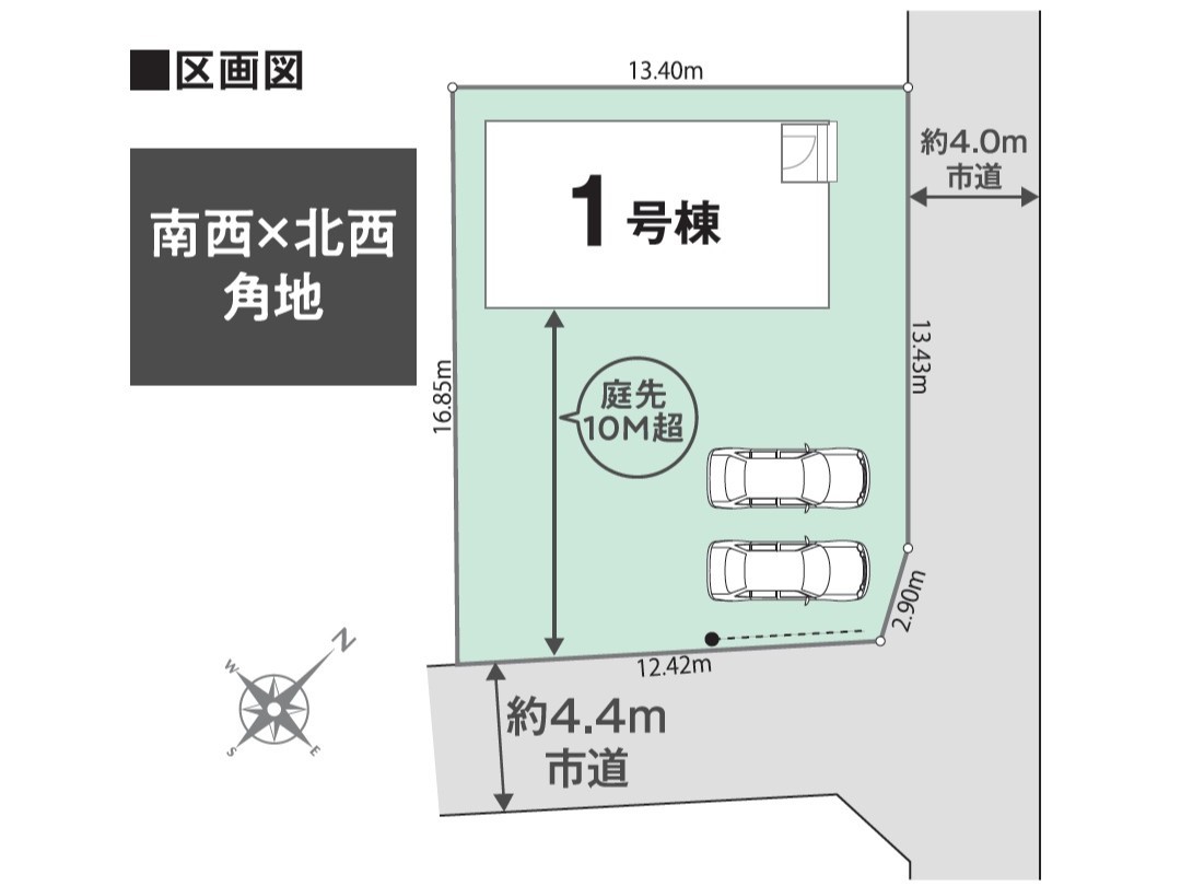 | 接道 | 東側4.4M公道に16.3M接道 南側4.4M公道に12.4M接道 |