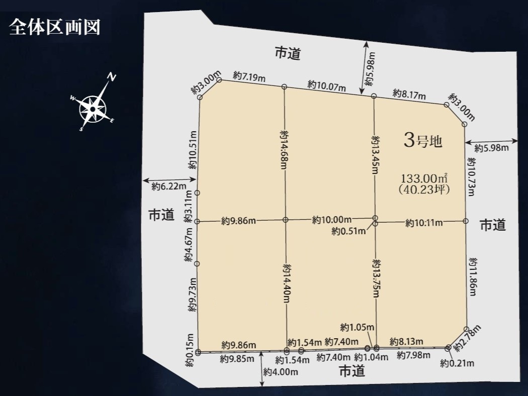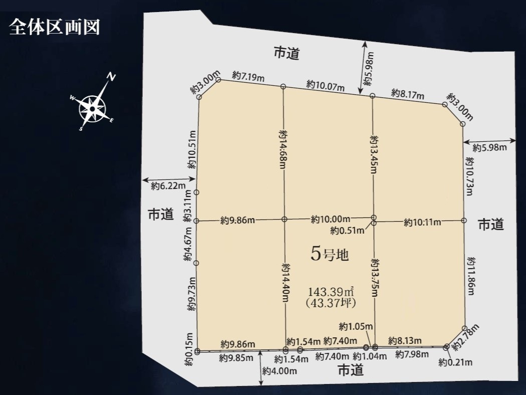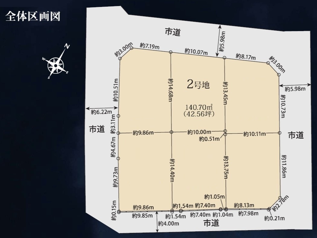 | 接道 | 東側5.98M公道に28.5M接道 西側6.22M公道に30.6M接道 南側3.7M公道に27.8M接道 北側5.98M公道に25.4M接道 |