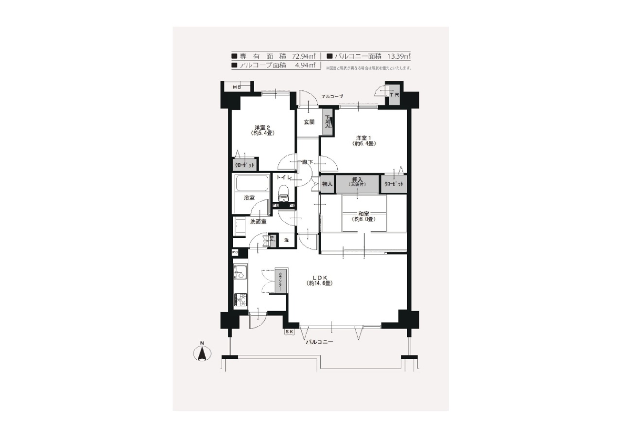 | 間取 | 3LDK (LDK14.6帖、洋室6.4帖、洋室5.4帖、和室6帖) | ||