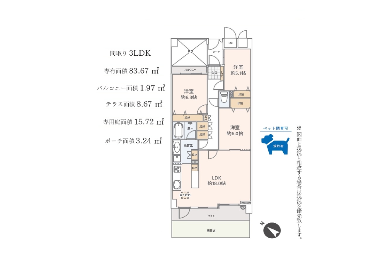 | 間取 | 3LDK (LDK18帖、洋室6.3帖、洋室6帖、洋室5.1帖) | ||