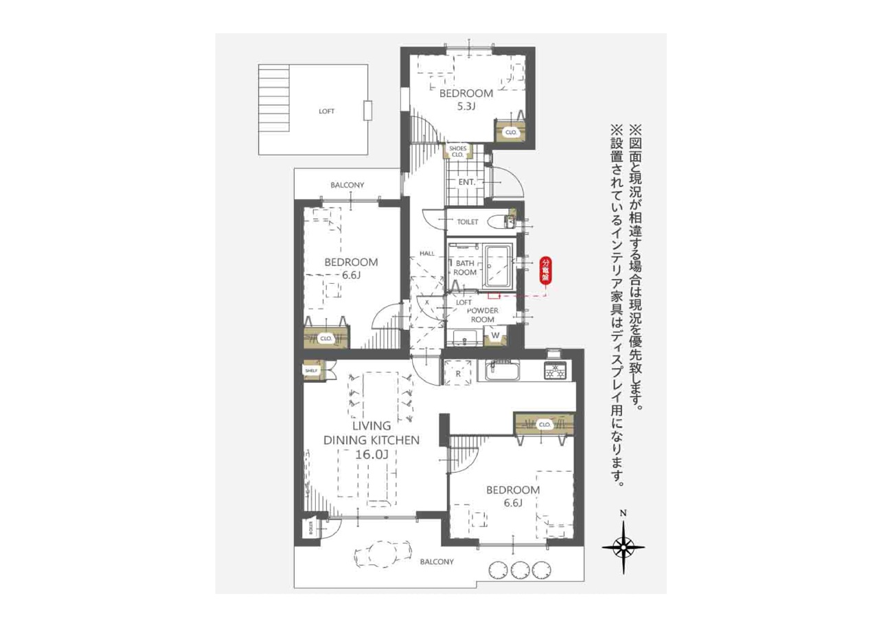 | 間取 | 3LDK (LDK16帖、洋室6.6帖、洋室6.6帖、洋室5.3帖) | ||